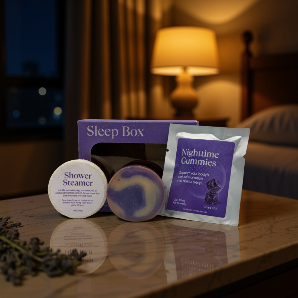 Give yourself or someone you love the gift of natural, restorative sleep. A restful night should feel effortless. The Sleep Box transforms your evening into a calming three step ritual that helps your body relax and your mind slow down. Start with our Calm Gummies to ease into a peaceful state, enjoy the comforting aromatherapy of the CBD Shower Steamer, then finish with the Lavender CBD Soap to prepare your body for deep sleep. Each element works together to support your natural sleep rhythm so you can fall asleep easier, stay asleep longer, and wake feeling refreshed and ready for your day. Whether you are treating yourself or sending comfort to someone you care about, Sleep Box makes bedtime something to look forward to.